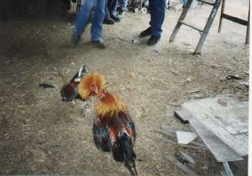 Cockfighting is a barbaric blood sport in which two roosters are placed in a pit to fight, usually to the death. Their natural spurs are sawed off and replaced by razor sharp steel blades called 'gaffs'. These blades measure up to three inches long. Both winners and losers suffer severe injuries such as broken wings, gouged eyes and punctured lungs. Cockfighting is illegal in all but THREE states: Louisiana, New Mexico and Oklahoma. |